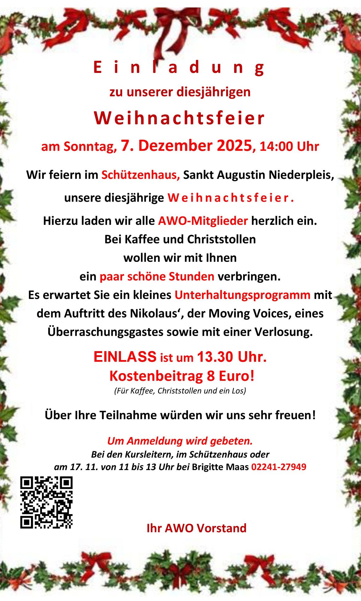 Unsere nächste WEIHNACHTS-FEIER für MITGLIEDER findet am 8. Dez. 2024 ab 13.30 Uhr im Schützenhaus Niederpleis statt!!